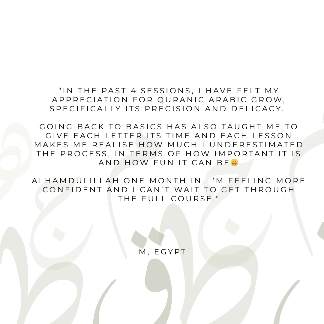 If you already recognise the alphabets and short vowels and feel you might progress faster, you may be able to complete your learning in just 12 sessions. In that case, please check out the Qaaidah Intensive Course.