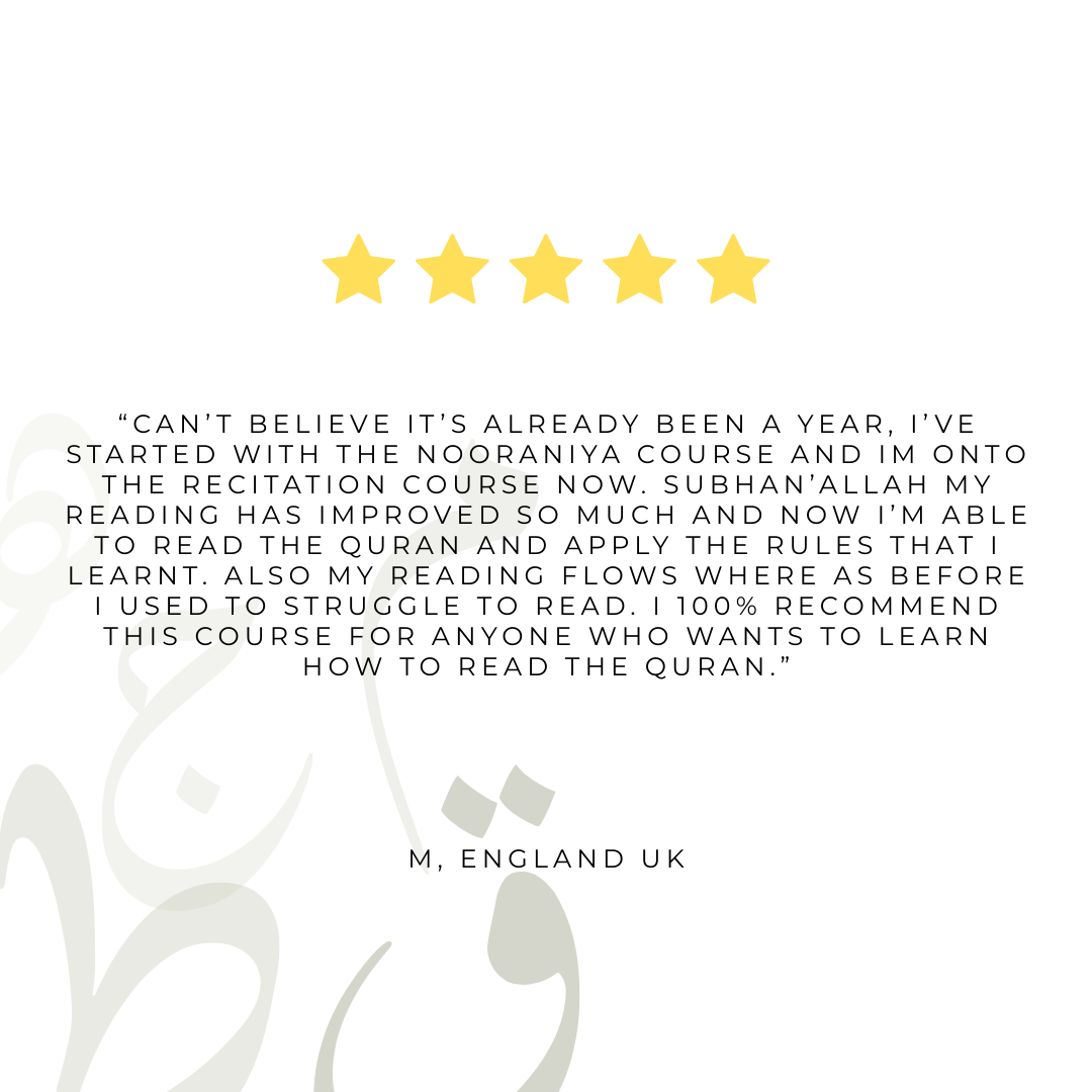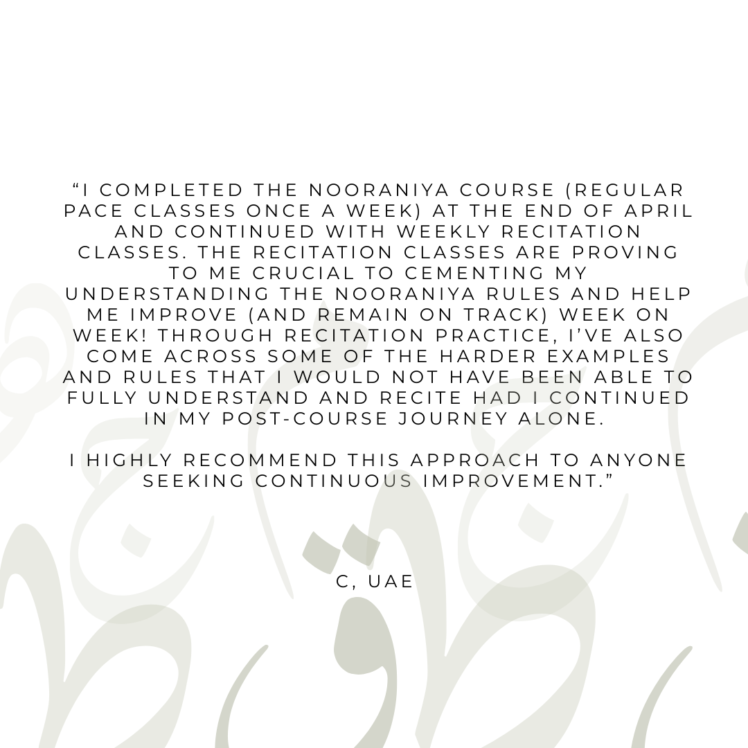 During this course, you will learn to recite the Qur’an with the correct pronunciation of the Arabic letters and the proper application of Tajweed rules. In Shaa Allah, as you progress, you will develop fluency and confidence in your recitation. Although the theory of Tajweed can be learned independently, true mastery requires listening to and reciting to a qualified Qur’an tutor who can correct even the slightest mistakes.